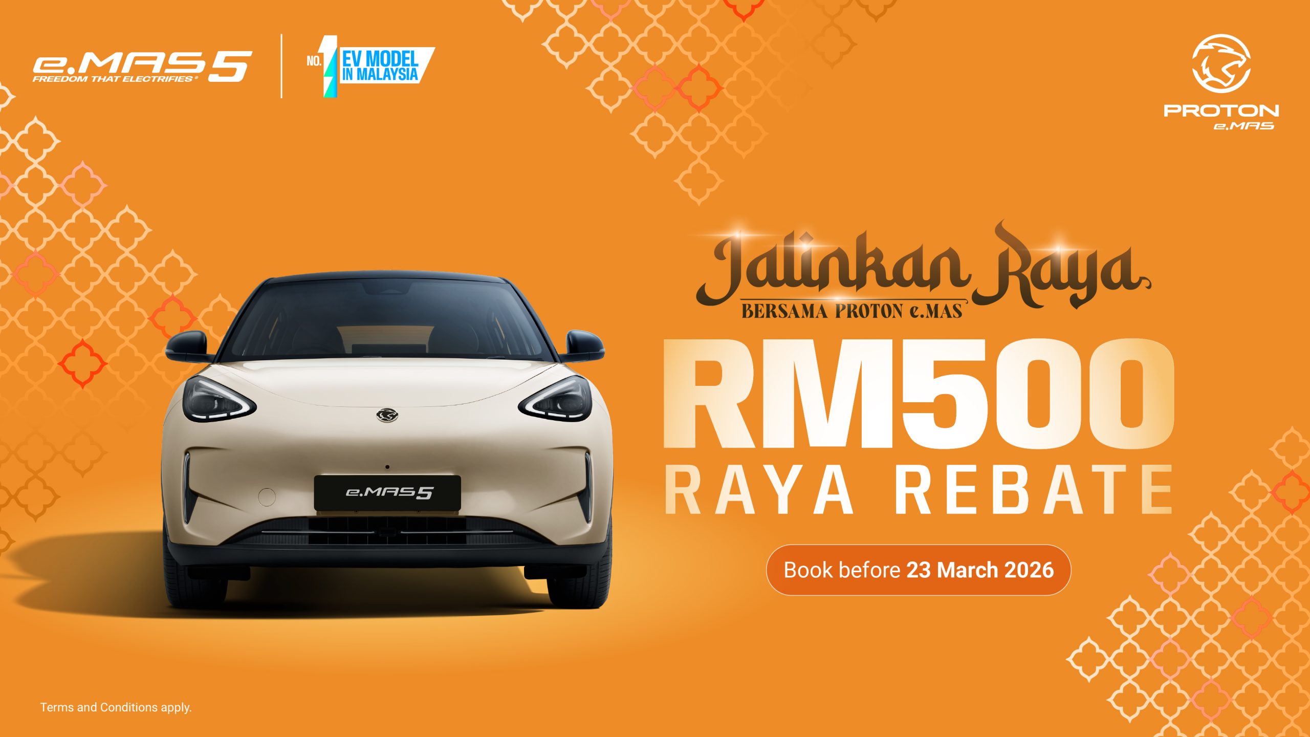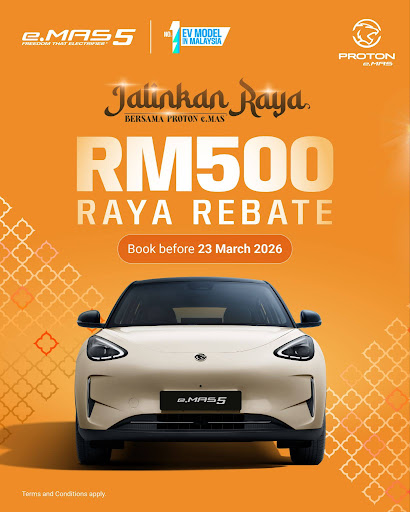 The RM500 Raya rebate for the Proton e.MAS 5 is valid for all bookings made until 23 March 2026, giving more Malaysians the opportunity to celebrate Hari Raya with the country’s No.1 EV.