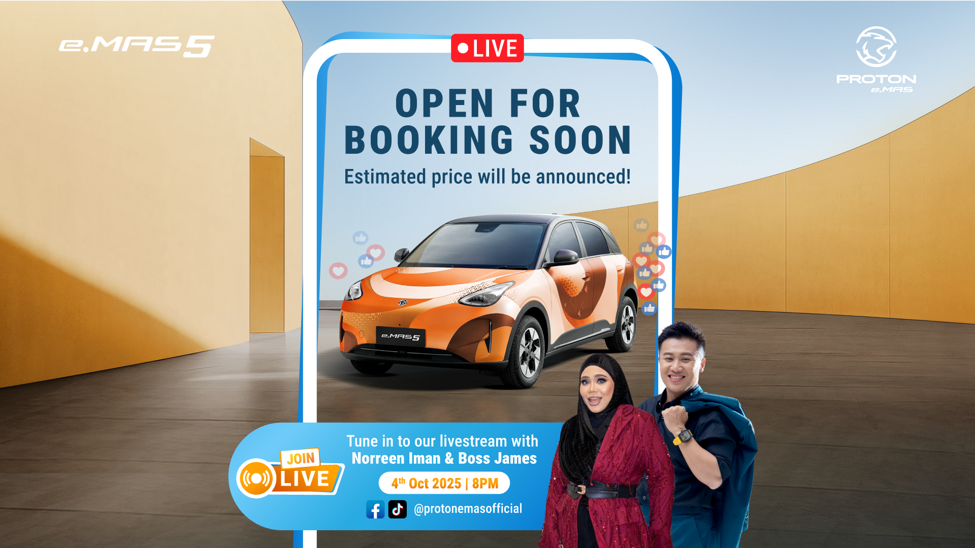 Shah Alam, 2 October 2025 - Proton New Energy Technology Sdn Bhd (PRO-NET), a wholly owned subsidiary of PROTON, announced that bookings for the all-new Proton e.MAS 5, Malaysia’s most affordable electric vehicle (EV), will officially start on Saturday, 4 October 2025 during the special livestream event, which will run from 8:00 PM to 10:30 PM.